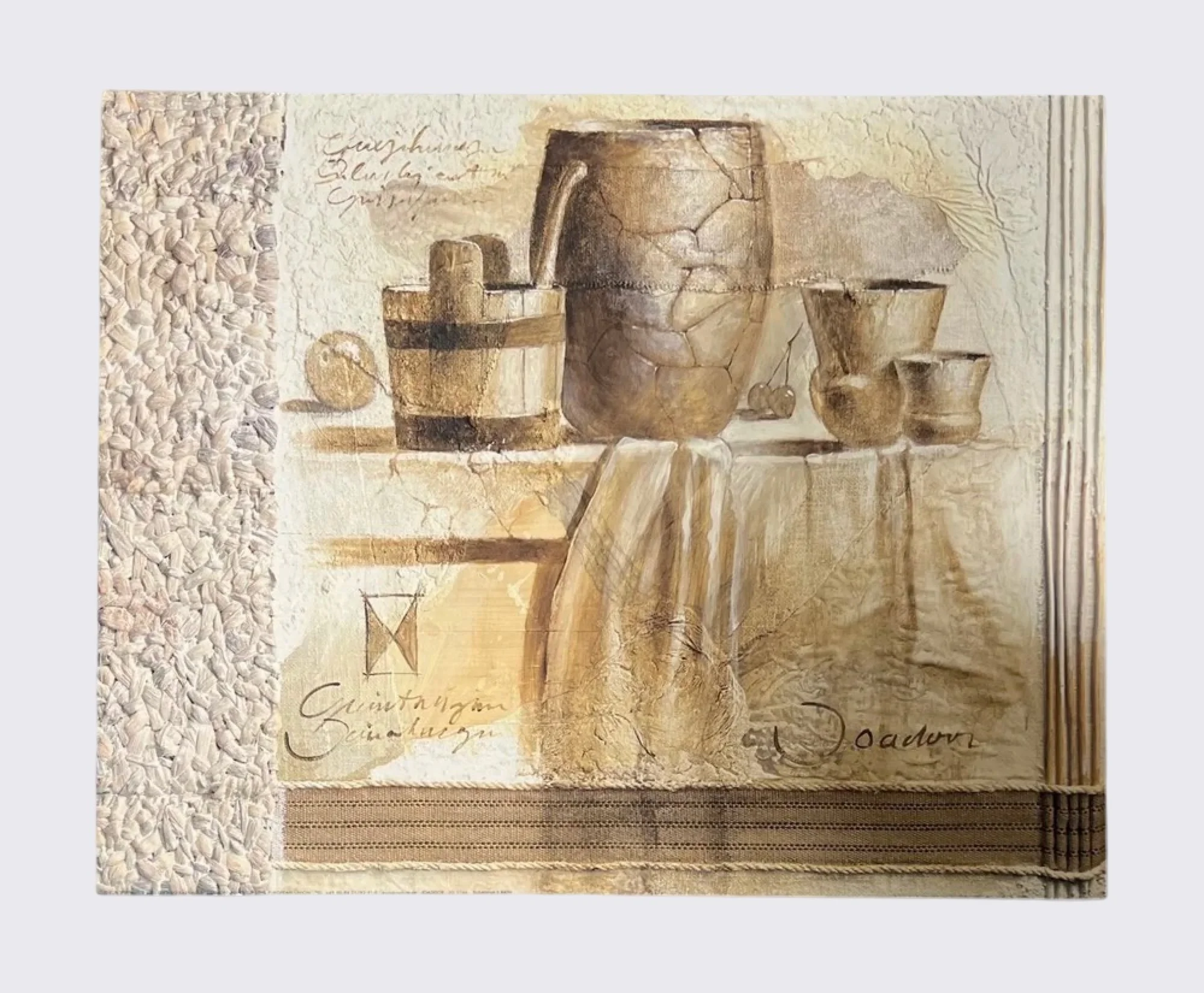 Botanical Still Life I $30.00 Fired Earth I $45.00 Fired Earth II $45.00 Decorative Bottles I $25.00 Decorative Bottles I (large) Sale Price: $25.00 Original Price: $35.00 Sale Susanna's Bath $20.00 Eggplant Vase $40.00 Red Vase $40.00 Green Vase $40.00 Garnet $45.00 Ebony $45.00 Orgins I $40.00 Global Pot I $50.00 Tribal Renaissance $16.00 Stone Urn $40.00 Alberoro $30.00 Terra Cotta I $40.00 Vessels with Fabric II $35.00 Garden Breeze $20.00 Fresh Winds $20.00 A Dish of Plums $30.00 Morning Room II $30.00 Bird & Fruit $55.00 Tulips $35.00 Tea For Two Sale Price: $20.00 Original Price: $25.00 Sale Corbeille et Coupe de Fruits Sale Price: $20.00 Original Price: $40.00 Sale Still Life with Cherries & Peaches $40.00 Tuscan Olives $25.00 Roman Fresco $40.00 Strawberries and Silver $30.00 Bird and Fruit Panel $20.00 Earth's Bounty I $30.00 Earth's Bounty III $30.00 Earth's Bounty IV $30.00 A Bowl of Peas & Two Roses $30.00 Chinese Dish with Artichokes $30.00 Morning Light II $30.00 Morning Light $30.00 Regallo I $35.00 Regallo II $35.00 Basket of Green Apple $25.00 Butter and Eggs $25.00 French Fruit Basket $40.00 Primitive Still Life II $25.00 Primitive Still Life I $25.00